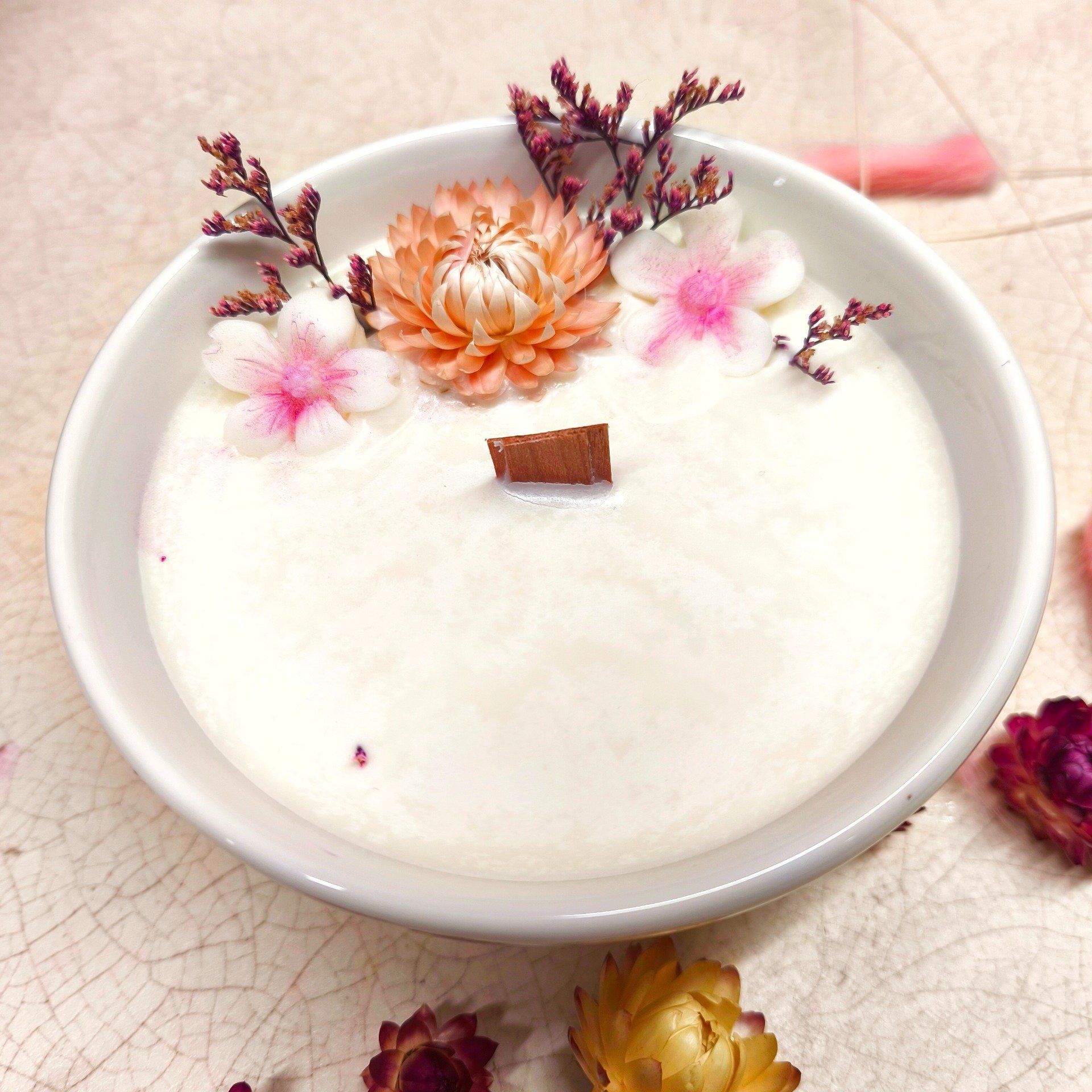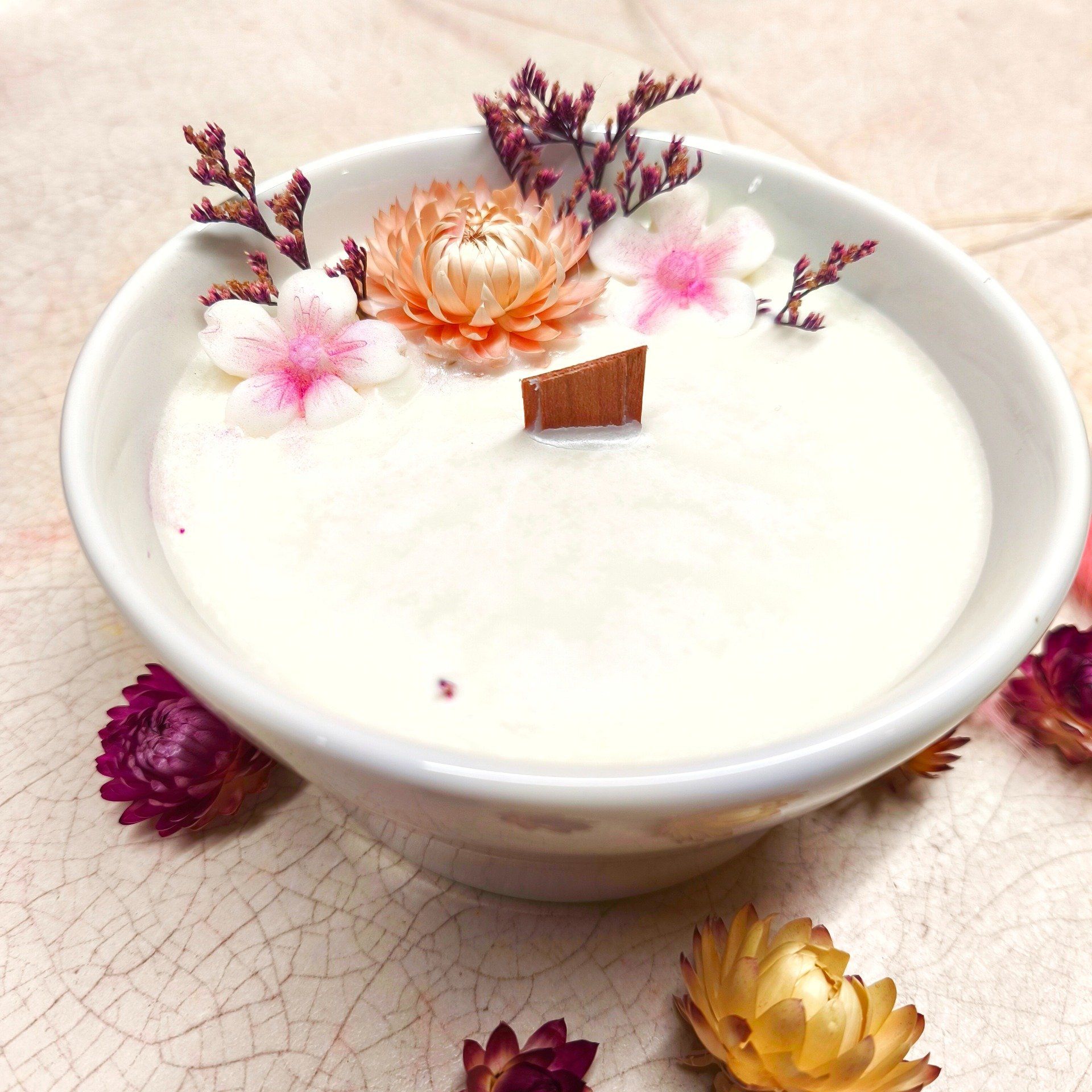 Les fleurs séchées sont locales d'origine française ou d'origne européenne. Décoration en cire végétale et mica