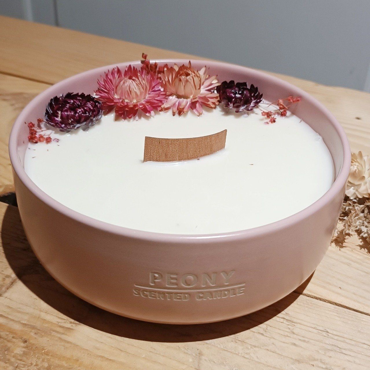 Cette bougie généreuse, contenant 600 ml de cire de la plus haute qualité, vous offre une expérience sensorielle inoubliable, sublimée par le parfum envoûtant de la pivoine et une composition généreuse en fleurs séchées. Présentée dans un pot en céramique rose pâle, orné du parfum gravé avec soin, cette bougie incarne l'élégance et le charme intemporel.