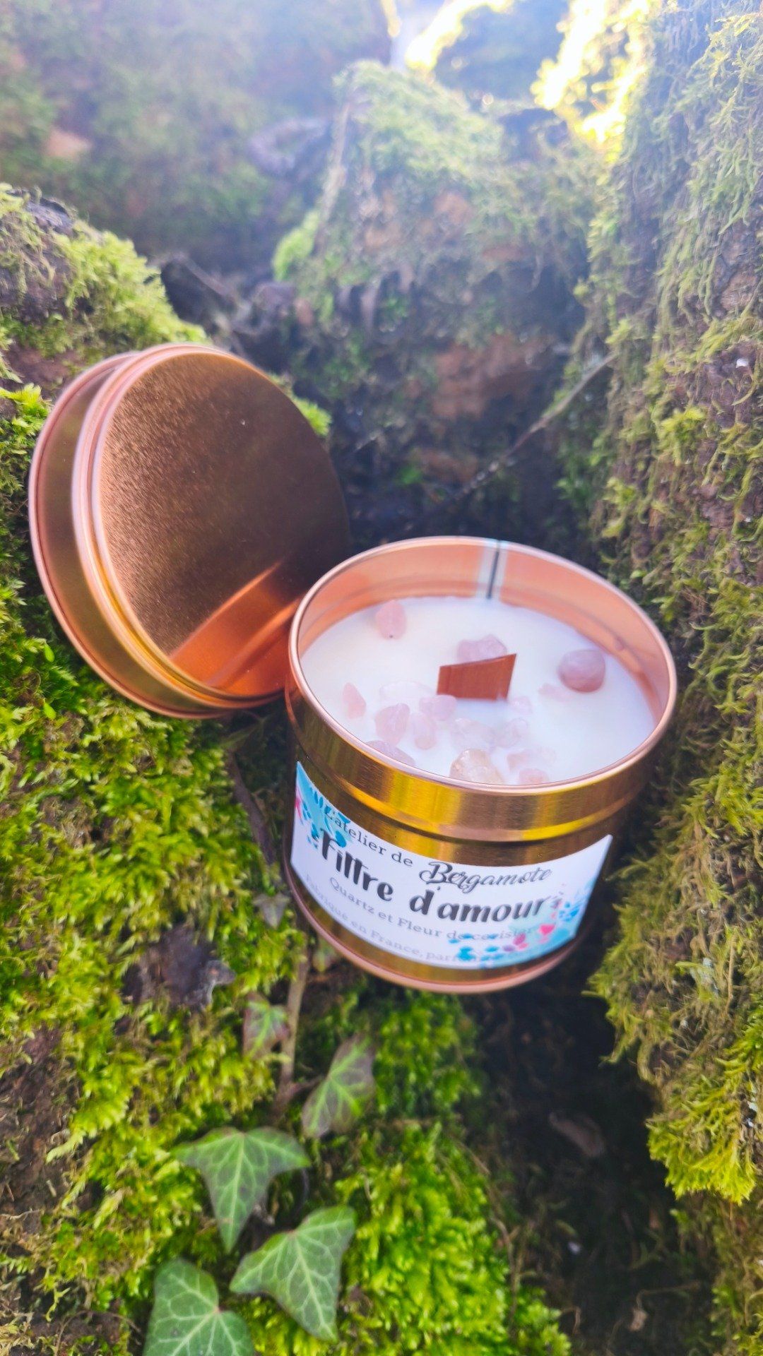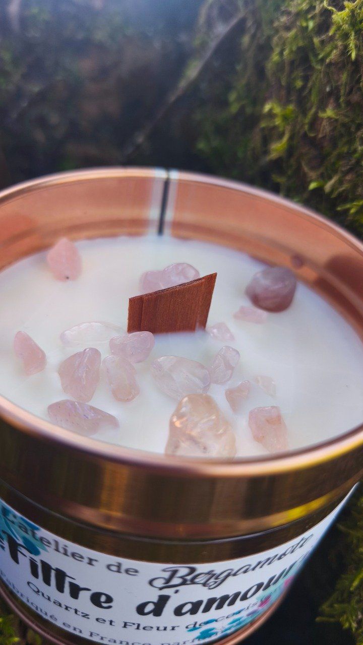 Rayonnez de douceur avec la bougie Filtre d'Amour. Nous avons associé la fleur de cerisier, symbole de renouveau, aux vertus apaisantes du Quartz rose.
