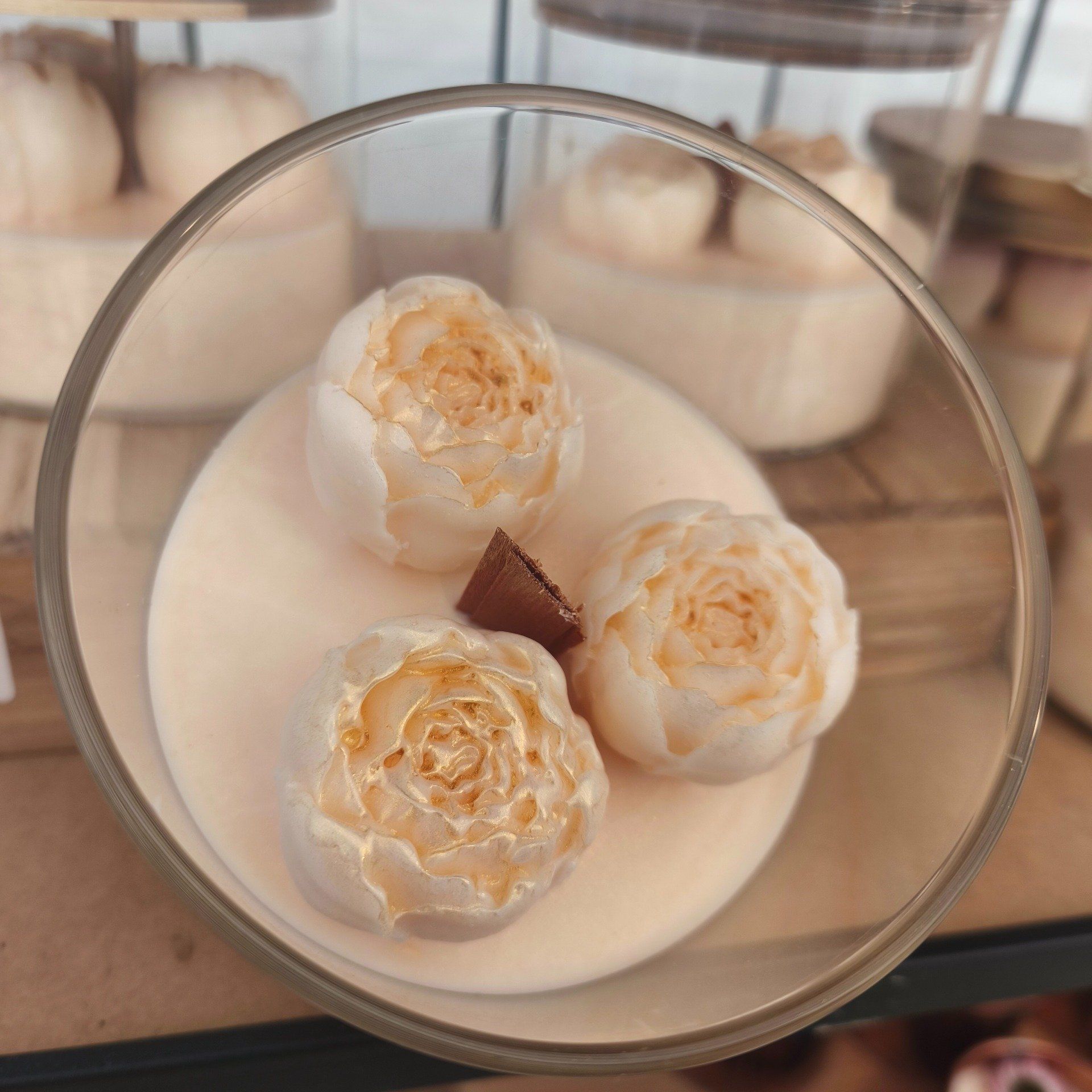 Chaque pétale de cire est subtilement rehaussé de poudre dorée scintillante, captant la lumière pour créer des reflets magiques. Son parfum Pivoine, frais, floral et légèrement poudré, libère une fragrance printanière et sophistiquée dès l'ouverture, même éteinte.